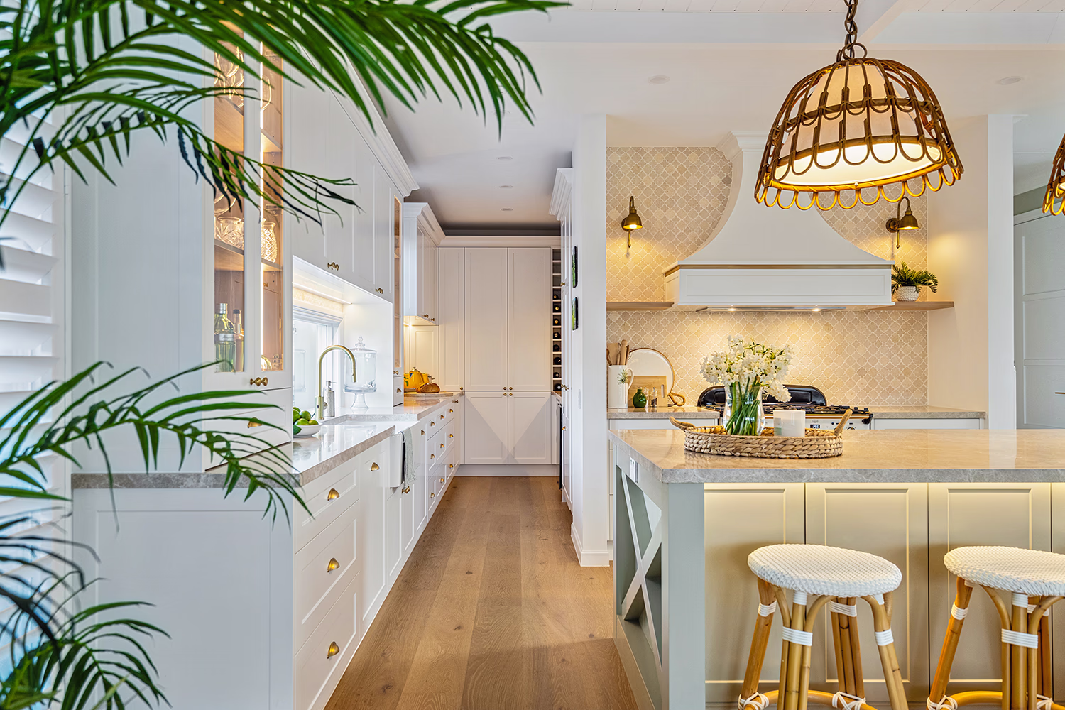 Casa del Rio is a joyful, show-stopping kitchen where British colonial elegance meets coastal Australian charm. Anchored by a striking brass-inlaid rangehood, the space blends beauty, flow, and warmth at the heart of the home.