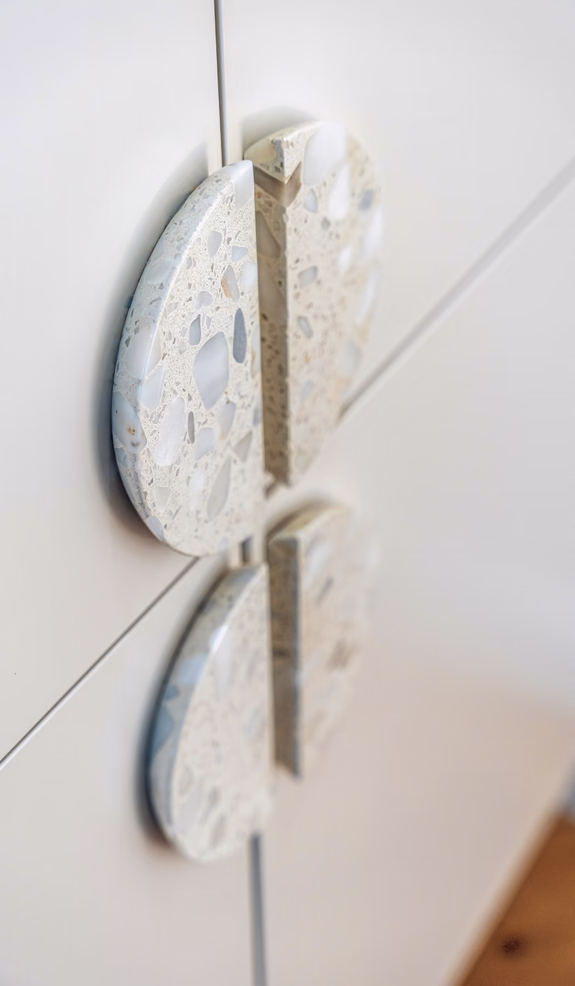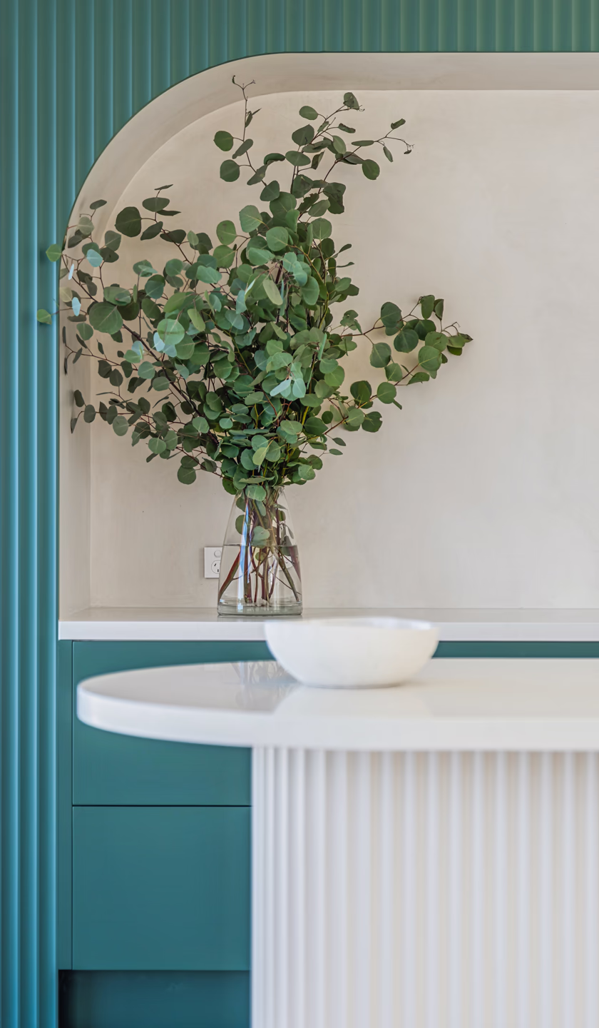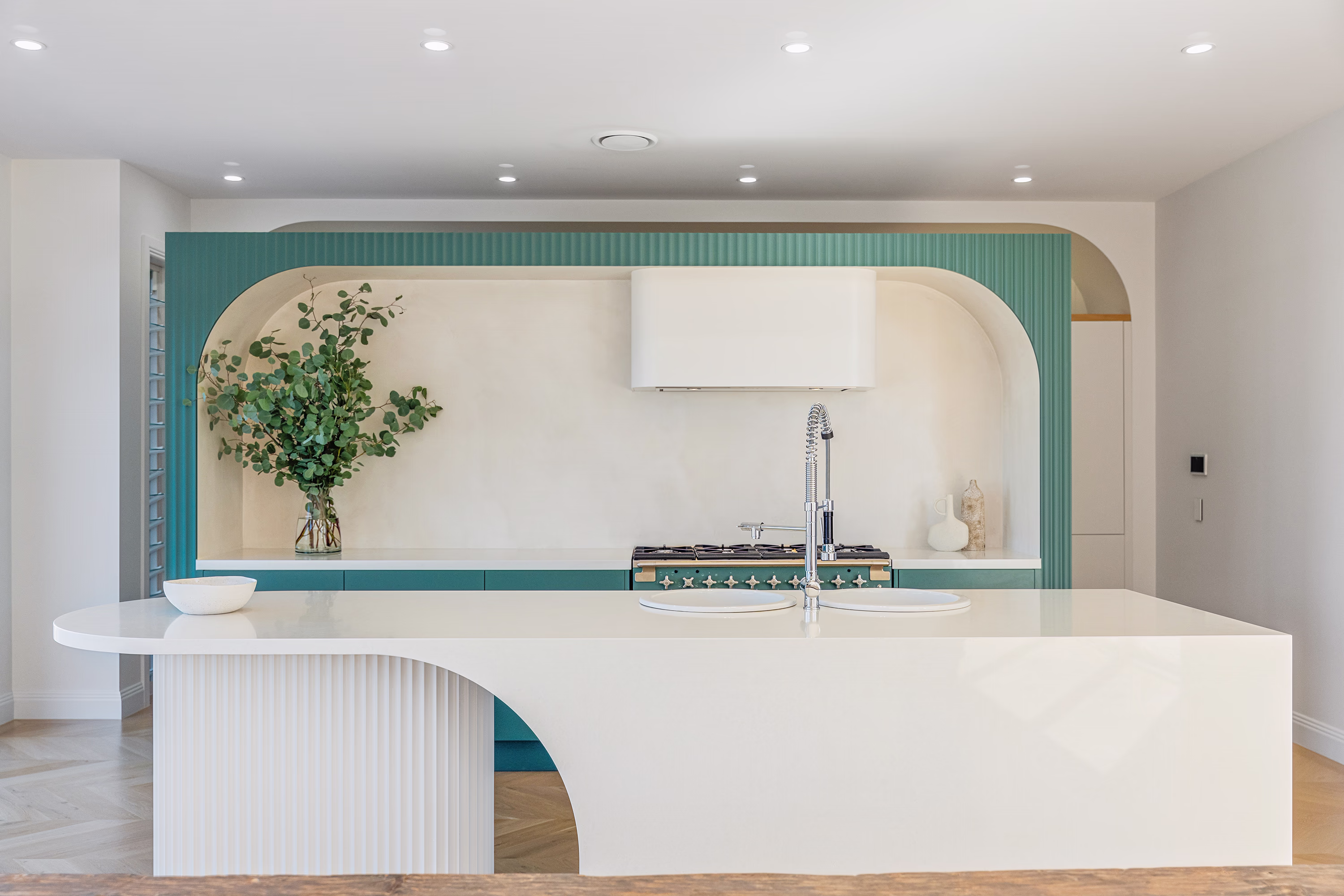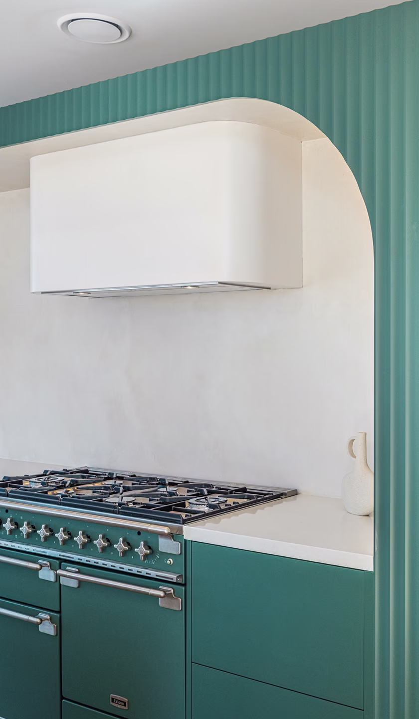 Sol Sora is a sculptural, travel-inspired kitchen blending refined aesthetics with everyday function. A scalloped feature wall and curved rangehood anchor the design, while arches and microcement finishes evoke Mediterranean calm.
