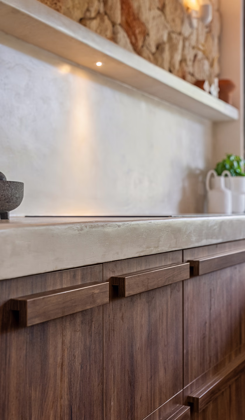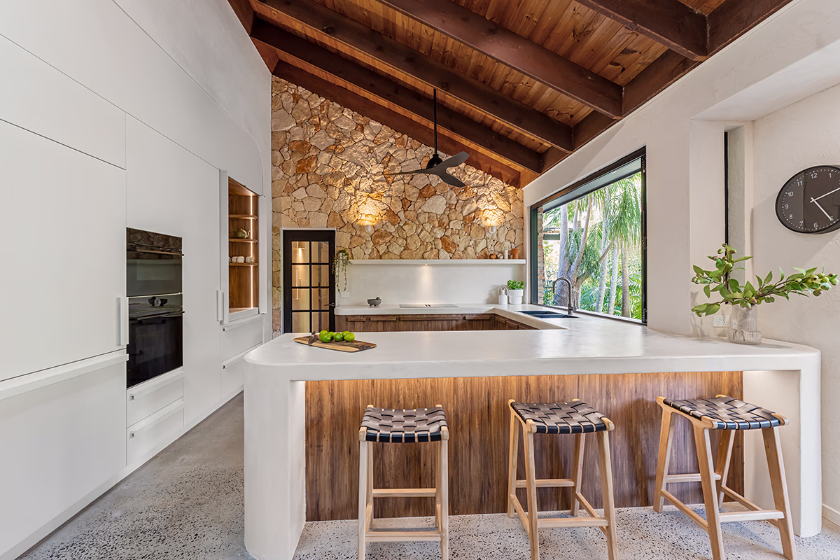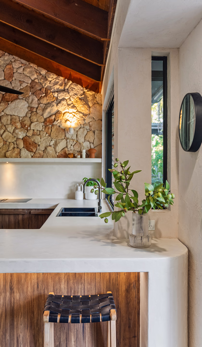 La Pietra is a Mediterranean-inspired reimagining of a 1980s home, rich in warmth and texture. A handcrafted stone wall anchors microcement surfaces and walnut-look joinery, creating a timeless, grounded kitchen.